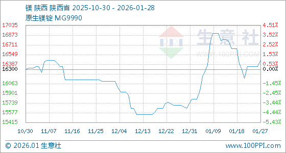 1月28日,生意社镁基准价为16450.00元/吨,与本月初(15725.00元/吨)相比,上涨了4.61%。