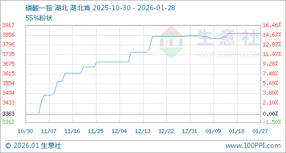 1月28日,生意社磷酸一铵基准价为3866.67元/吨,与本月初(3853.33元/吨)相比,上涨了0.35%。