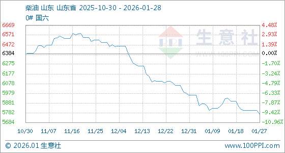 1月28日,生意社柴油基准价为5766.40元/吨,与本月初(5961.00元/吨)相比,下降了3.26%。