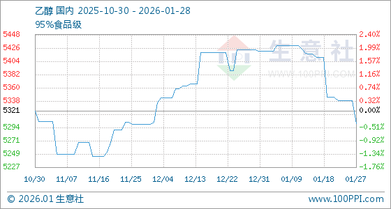 1月28日,生意社乙醇基准价为5300.56元/吨,与本月初(5421.11元/吨)相比,下降了2.22%。
