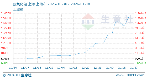 1月28日,生意社氢氧化锂(工业级)基准价为155000.00元/吨,与本月初(101833.33元/吨)相比,上涨了52.21%。