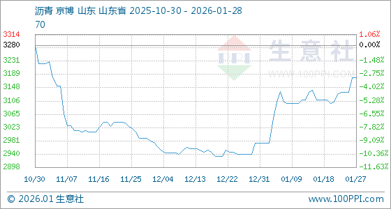 1月28日,生意社沥青基准价为3180.00元/吨,与本月初(2973.33元/吨)相比,上涨了6.95%。