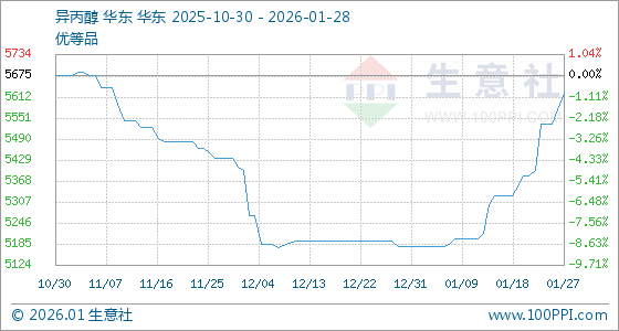 1月28日,生意社异丙醇基准价为5625.00元/吨,与本月初(5176.66元/吨)相比,上涨了8.66%。