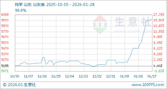 1月28日,生意社纯苯基准价为5986.67元/吨,与本月初(5268.67元/吨)相比,上涨了13.63%。
