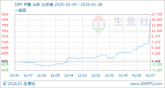1月28日,生意社DBP基准价为7718.33元/吨,与本月初(6751.67元/吨)相比,上涨了14.32%。