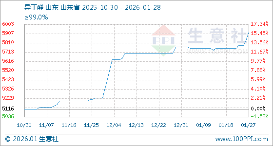 1月28日,生意社异丁醛基准价为5923.33元/吨,与本月初(5766.67元/吨)相比,上涨了2.72%。
