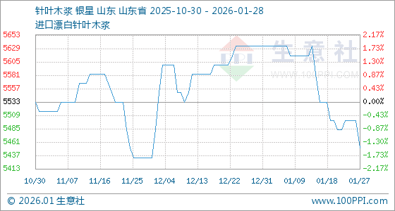 1月28日,生意社针叶木浆基准价为5450.00元/吨,与本月初(5633.33元/吨)相比,下降了3.25%。