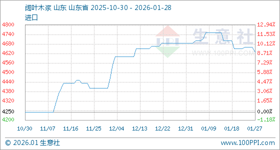 1月28日,生意社阔叶木浆基准价为4626.67元/吨,与本月初(4683.33元/吨)相比,下降了1.21%。