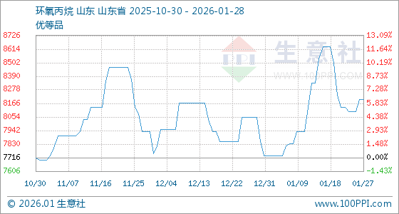 1月28日,生意社环氧丙烷基准价为8200.00元/吨,与本月初(7733.33元/吨)相比,上涨了6.03%。