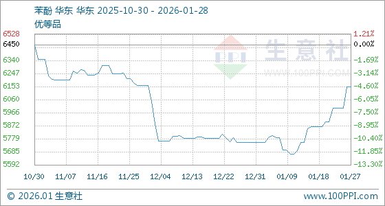 1月28日,生意社苯酚基准价为6150.00元/吨,与本月初(5750.00元/吨)相比,上涨了6.96%。