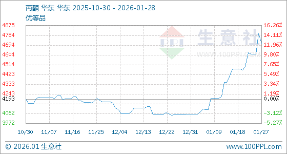 1月28日,生意社丙酮基准价为4712.50元/吨,与本月初(4057.50元/吨)相比,上涨了16.14%。