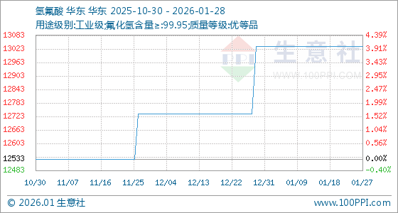 1月28日,生意社氢氟酸基准价为13033.33元/吨,与本月初持平。