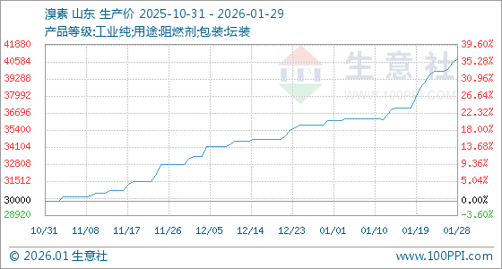 1月29日,生意社溴素基准价为40800.00元/吨,与本月初(36100.00元/吨)相比,上涨了13.02%。
