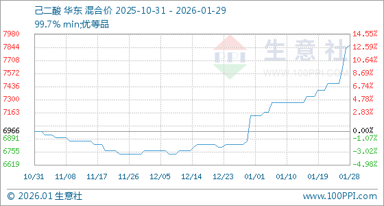 1月29日,生意社己二酸基准价为7866.67元/吨,与本月初(7133.33元/吨)相比,上涨了10.28%。