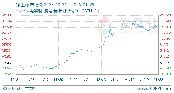 1月29日,生意社铜基准价为101628.33元/吨,与本月初(99180.00元/吨)相比,上涨了2.47%。
