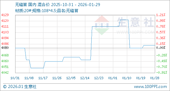 1月29日,生意社无缝管基准价为4084.00元/吨,与本月初(4112.00元/吨)相比,下降了0.68%。
