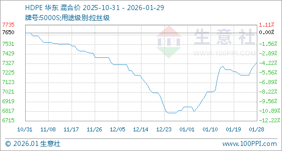 1月29日,生意社HDPE基准价为7337.50元/吨,与本月初(6862.50元/吨)相比,上涨了6.92%。