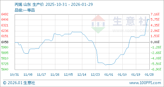 1月29日,生意社丙烯基准价为6411.00元/吨,与本月初(5717.67元/吨)相比,上涨了12.13%。