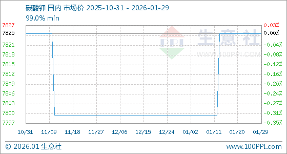 1月29日,生意社碳酸钾基准价为7825.00元/吨,与本月初(7800.00元/吨)相比,上涨了0.32%。