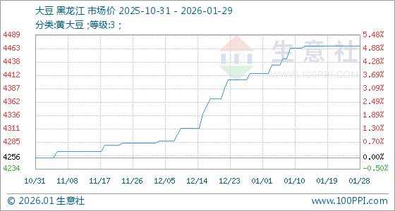 1月29日,生意社大豆基准价为4468.00元/吨,与本月初(4416.00元/吨)相比,上涨了1.18%。
