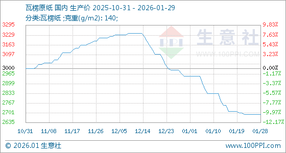 1月29日,生意社瓦楞原纸基准价为2690.00元/吨,与本月初(2950.00元/吨)相比,下降了8.81%。