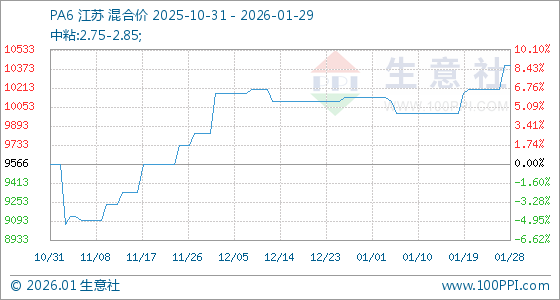 1月29日,生意社PA6基准价为10400.00元/吨,与本月初(10133.33元/吨)相比,上涨了2.63%。