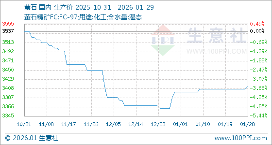 1月29日,生意社萤石基准价为3412.50元/吨,与本月初(3400.00元/吨)相比,上涨了0.37%。