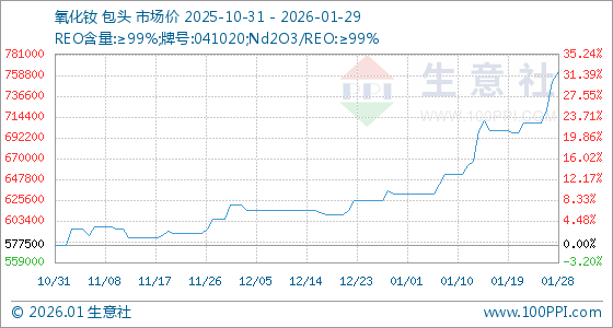 1月29日,生意社氧化钕基准价为762500.00元/吨,与本月初(632500.00元/吨)相比,上涨了20.55%。