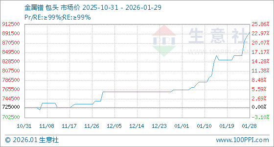 1月29日,生意社金属镨基准价为895000.00元/吨,与本月初(765000.00元/吨)相比,上涨了16.99%。