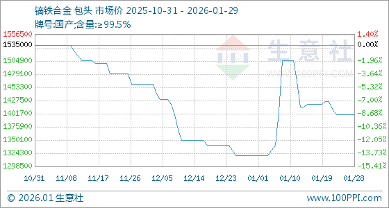 1月29日,生意社镝铁合金基准价为1400000.00元/吨,与本月初(1320000.00元/吨)相比,上涨了6.06%。
