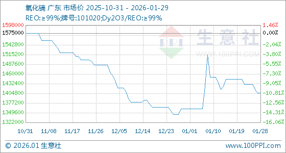 1月29日,生意社氧化镝基准价为1405000.00元/吨,与本月初(1360000.00元/吨)相比,上涨了3.31%。