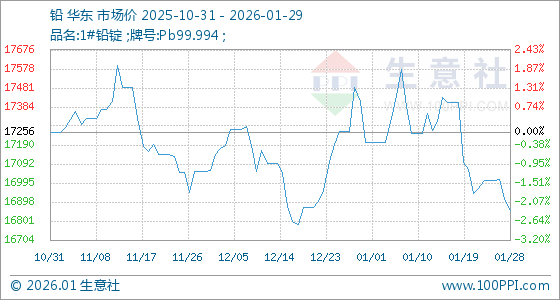 1月29日,生意社铅基准价为16855.00元/吨,与本月初(17205.00元/吨)相比,下降了2.03%。