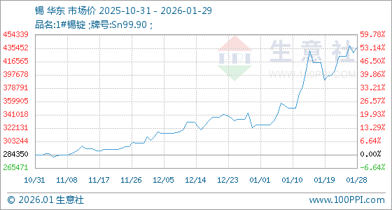 1月29日,生意社锡基准价为436650.00元/吨,与本月初(326340.00元/吨)相比,上涨了33.80%。