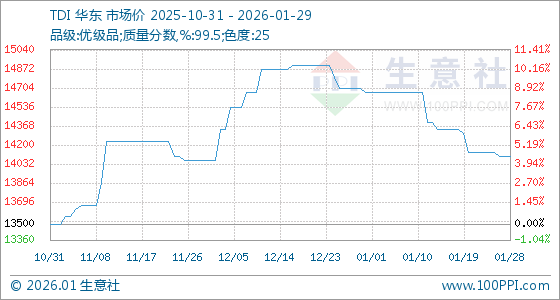 1月29日,生意社TDI基准价为14100.00元/吨,与本月初(14666.67元/吨)相比,下降了3.86%。