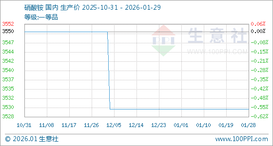 1月29日,生意社硝酸铵基准价为3530.00元/吨,与本月初持平。