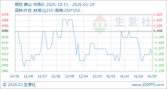 1月29日,生意社钢坯基准价为3010.00元/吨,与本月初持平。