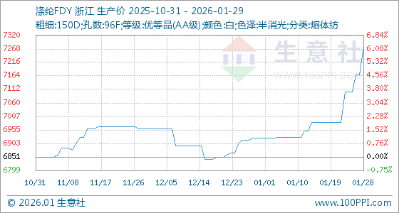 1月29日,生意社涤纶FDY基准价为7276.67元/吨,与本月初(6925.00元/吨)相比,上涨了5.08%。