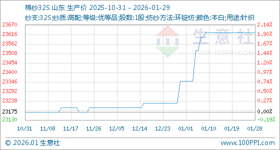 1月29日,生意社棉纱32S基准价为23625.00元/吨,与本月初(23350.00元/吨)相比,上涨了1.18%。