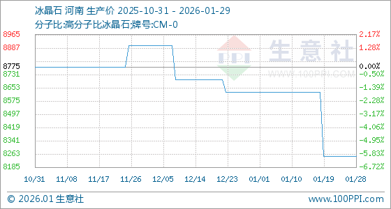 1月29日,生意社冰晶石基准价为8250.00元/吨,与本月初(8625.00元/吨)相比,下降了4.35%。