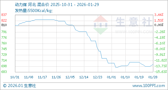 1月29日,生意社动力煤基准价为703.75元/吨,与本月初(707.50元/吨)相比,下降了0.53%。