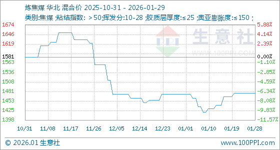 1月29日,生意社炼焦煤基准价为1476.25元/吨,与本月初(1473.75元/吨)相比,上涨了0.17%。