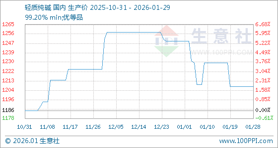 1月29日,生意社轻质纯碱基准价为1208.00元/吨,与本月初(1250.00元/吨)相比,下降了3.36%。