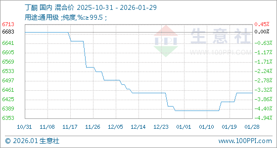 1月29日,生意社丁酮基准价为6450.00元/吨,与本月初(6383.33元/吨)相比,上涨了1.04%。