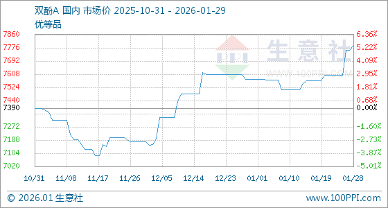 1月29日,生意社双酚A基准价为7790.00元/吨,与本月初(7576.00元/吨)相比,上涨了2.82%。