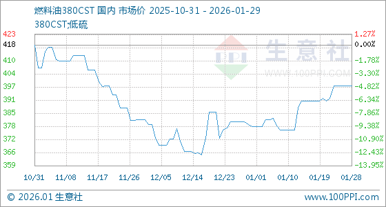 1月29日,生意社燃料油380CST基准价为398.50美元/吨,与本月初(378.50美元/吨)相比,上涨了5.28%。