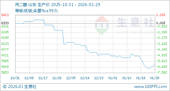1月29日,生意社丙二醇基准价为5933.33元/吨,与本月初(6016.67元/吨)相比,下降了1.39%。