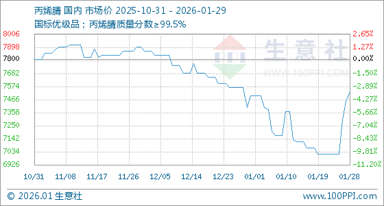 1月29日,生意社丙烯腈基准价为7533.33元/吨,与本月初(7500.00元/吨)相比,上涨了0.44%。