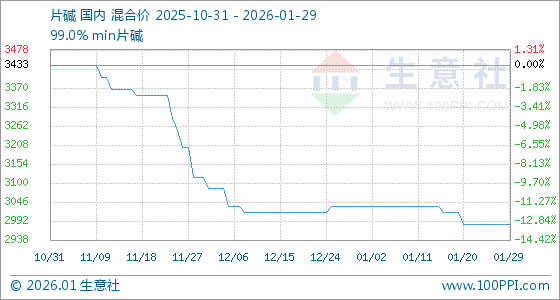 1月29日,生意社片碱基准价为2983.33元/吨,与本月初(3033.33元/吨)相比,下降了1.65%。