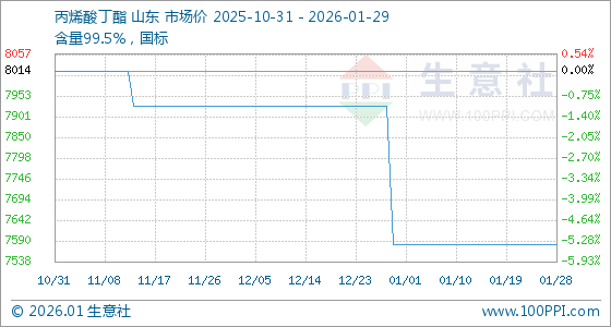 1月29日,生意社丙烯酸丁酯基准价为7582.14元/吨,与本月初持平。