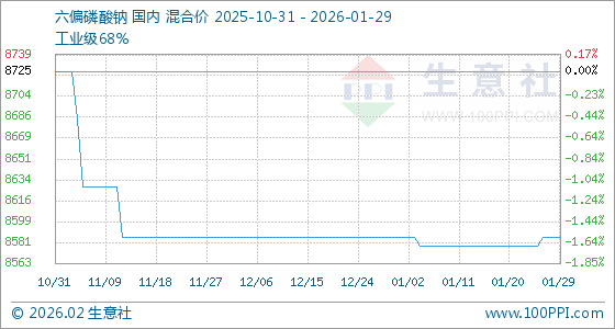 1月29日,生意社六偏磷酸钠基准价为8585.71元/吨 ,与本月初持平。